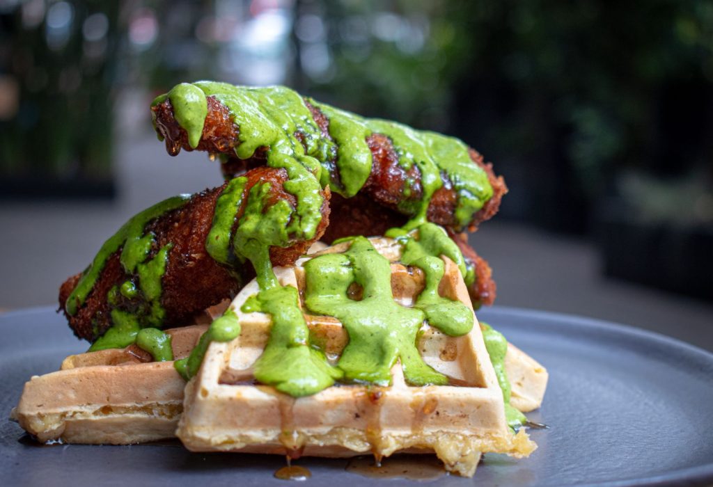 Waffles y pollo frito con maple y cilantro. Así suena y así se siente: crujiente, esponjoso, con ese contraste que consuela. Ideal para brunchear sin culpa, solo o con resaca.