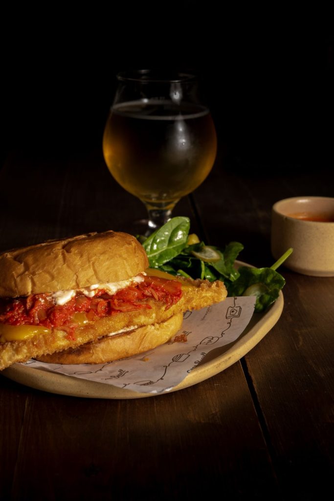 Sándwich Chicken con pan de papa, cheddar, kimchi y mayonesa de cacahuate. Suena rudo, sabe a hogar. Un toque callejero con mirada casera.
