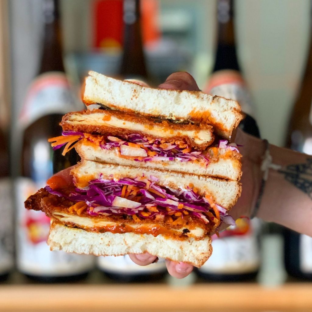 Un sándwich minimalista pero demoledor: pan de leche, col encurtida, pollo empanizado en panko y una salsa búfalo que despierta. Japón filtrado por la calle Roma.