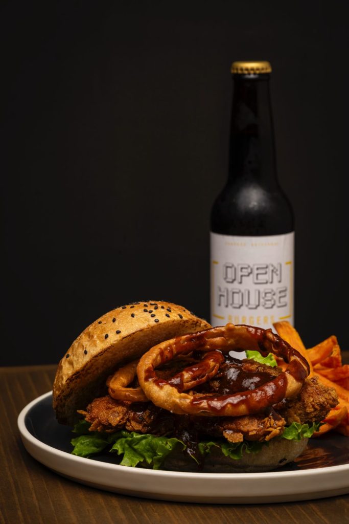 Crunch sin censura. Hamburguesa con pechuga empanizada en hojuelas de maíz, aros de cebolla y spicy chipotle. Una bomba que pide chela artesanal de acompañante.